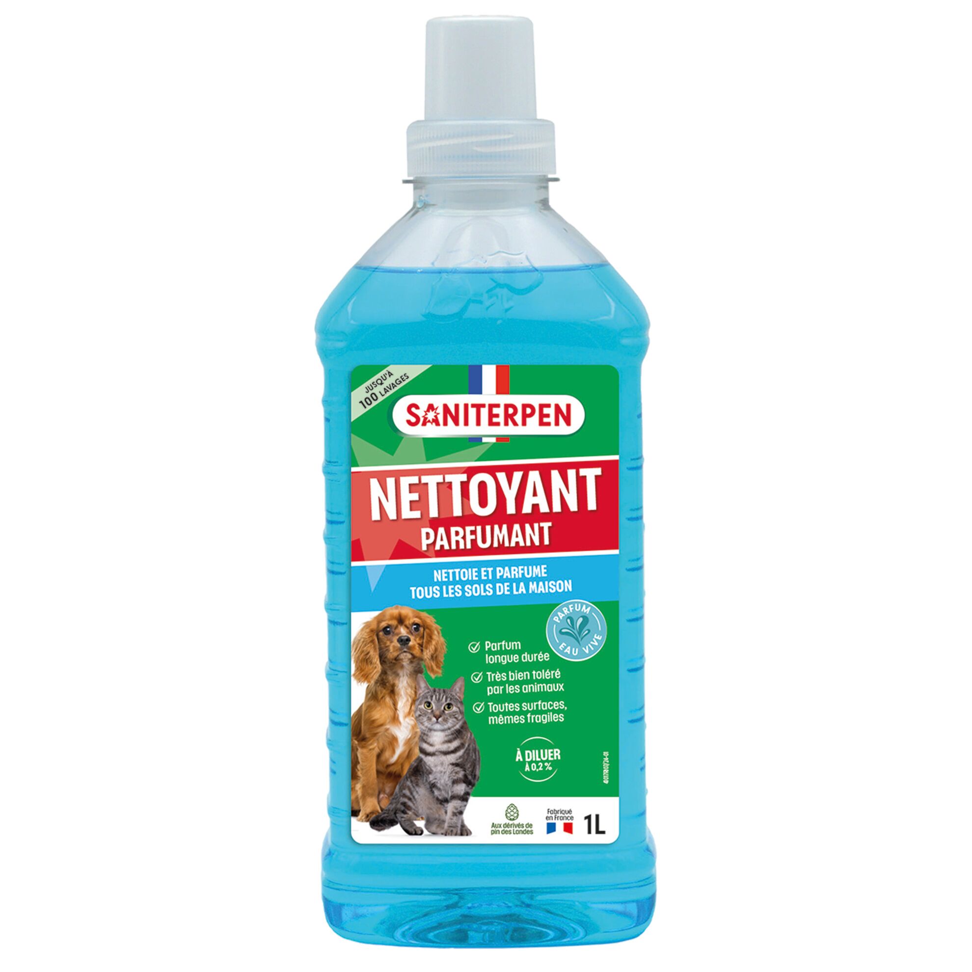 Saniterpen Détergent Parfumant nettoie et parfume tous types de sols et surfaces des lieux fréquentés par les animaux de compagnie (chiens, chats,...).