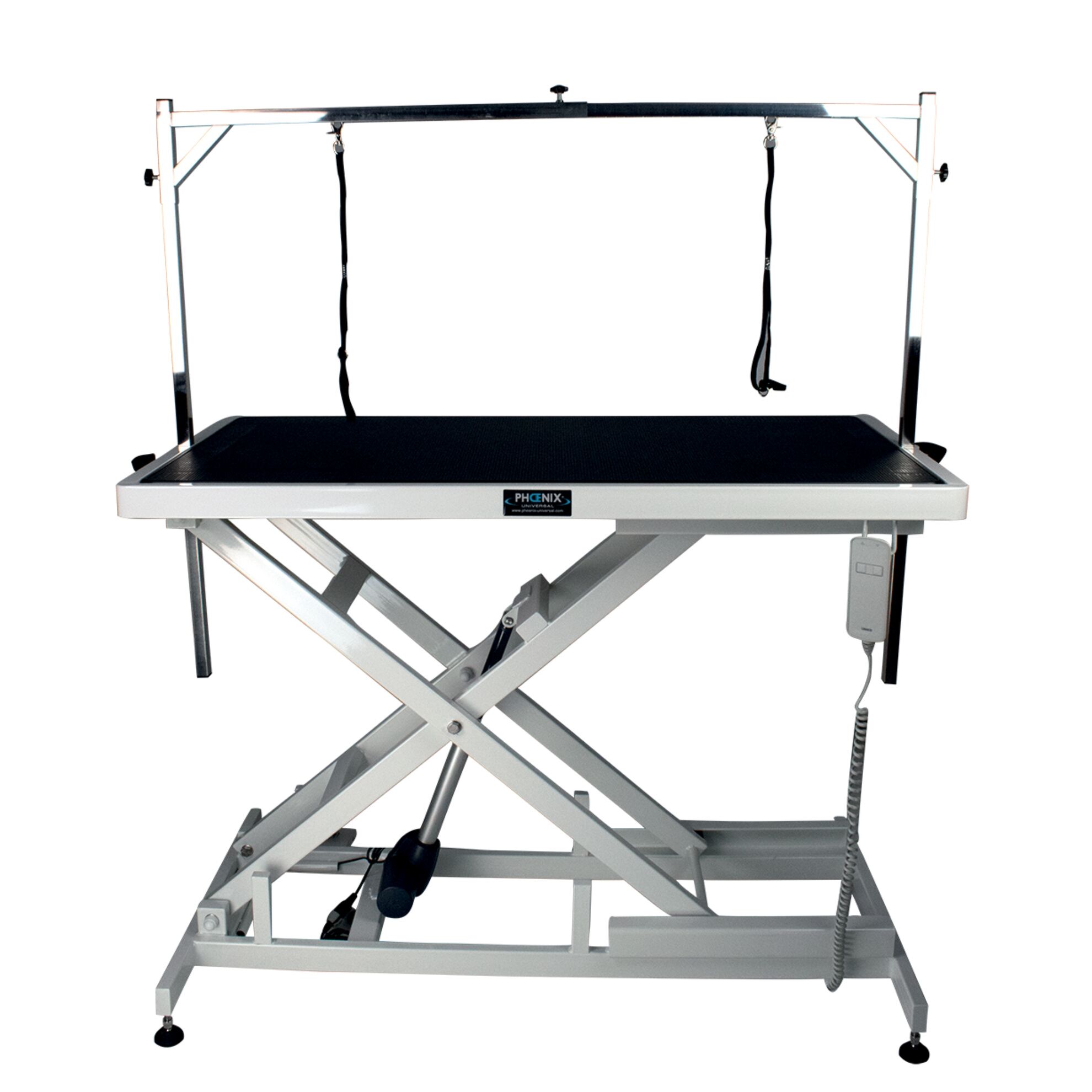 Cette table de toilettage Callisto Phoenix Universal possède une double commande : à pied ou à main.