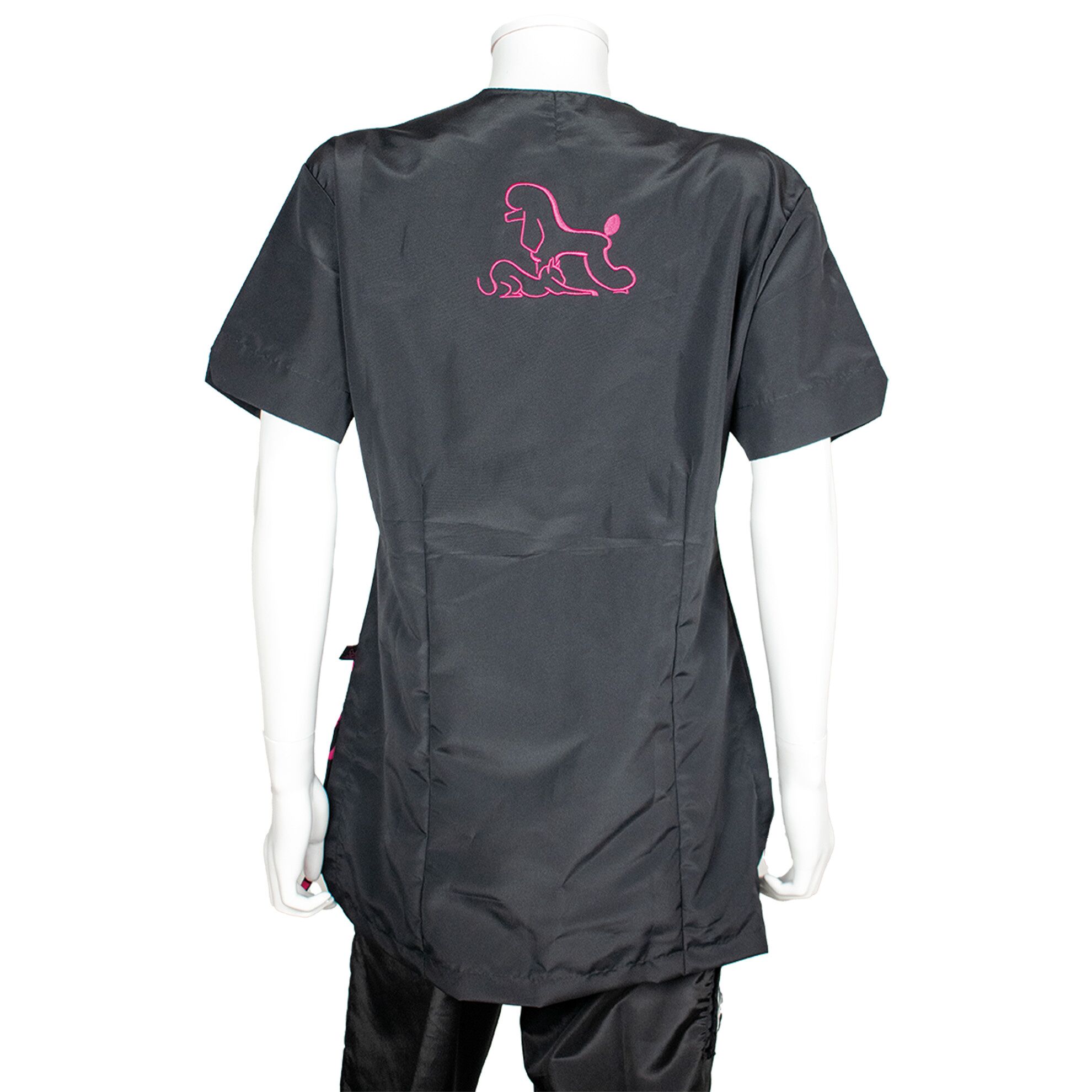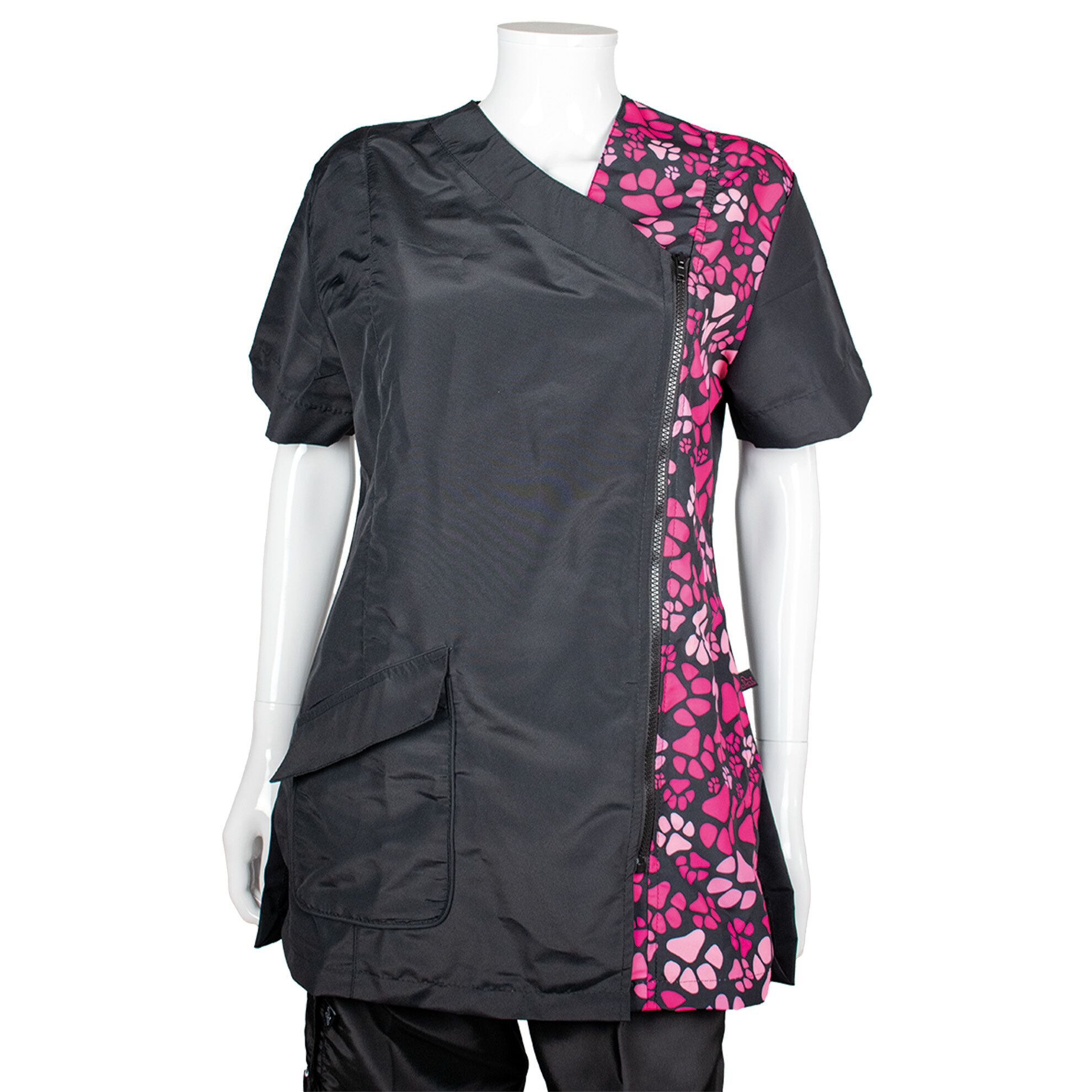 La blouse de toilettage Maria motif pattes roses allie confort, praticité et protection pour un usage quotidien en salon.