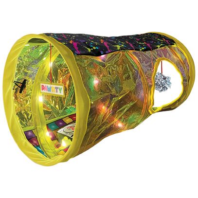 Tunnel interactif pour chat avec sol crépitant, sons activés par le mouvement (ambiance techno 90’s), lumières clignotantes et boule à facettes suspendue. Pliable et facile à ranger, idéal pour stimuler le jeu, la chasse et l’exploration.