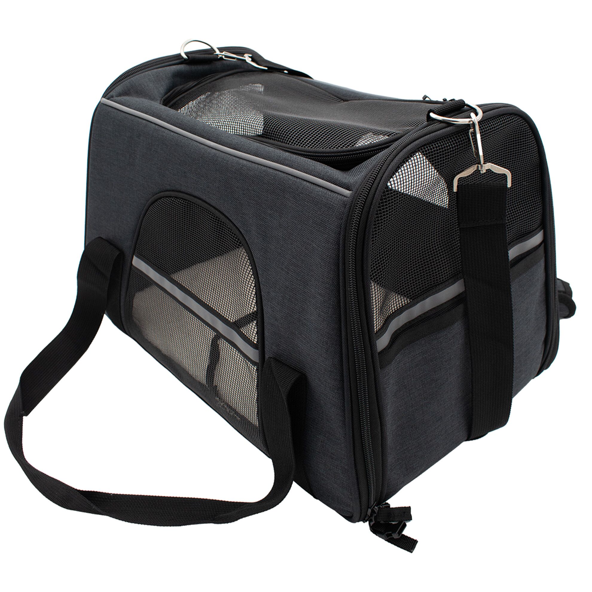 Sac pratique et confortable pour petits animaux jusqu’à 5 kg. Multiples ouvertures zippées, aération 360°, fond rigide amovible et sangle de sécurité intérieure. Transport facile à la main, à l’épaule et compatible valise.