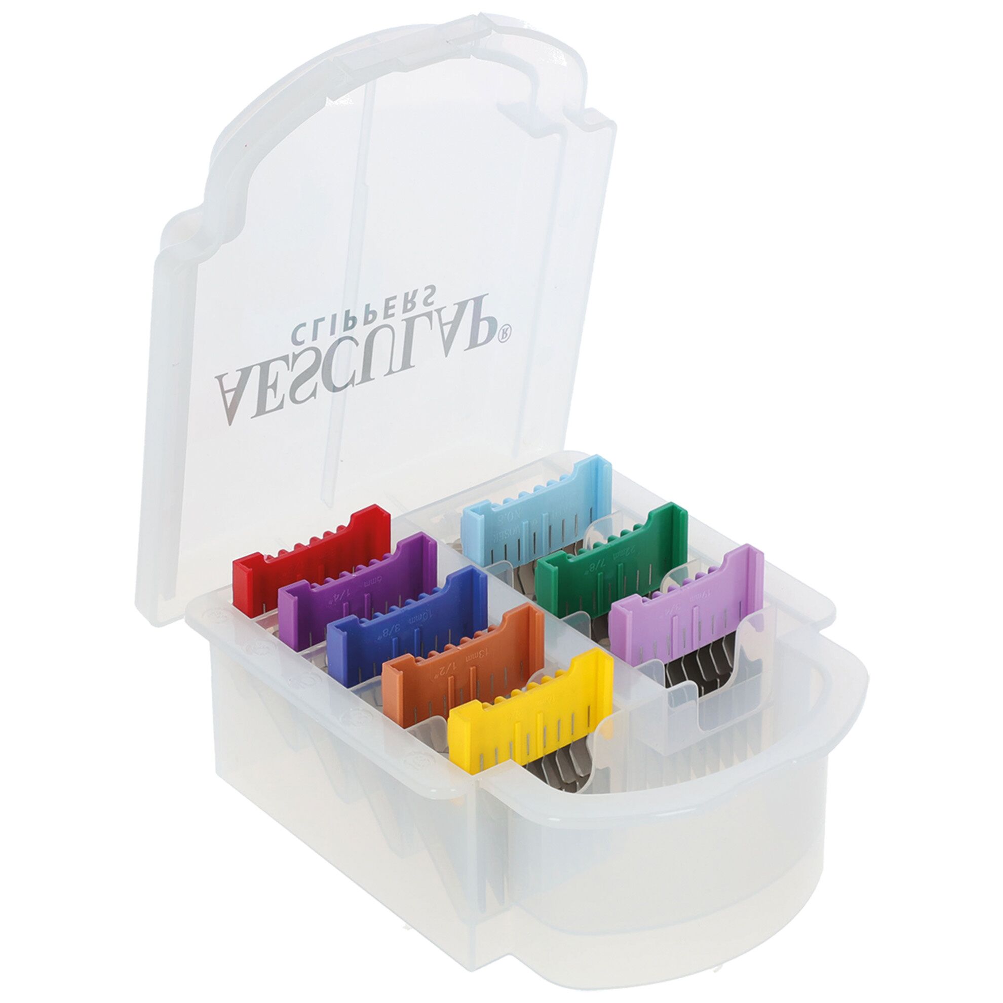 8 sabots code couleur pour des coupes régulières et maîtrisées, de 3 à 25 mm. Dents en acier inoxydable indéformable pour une glisse facile dans le pelage et une mise en place rapide.